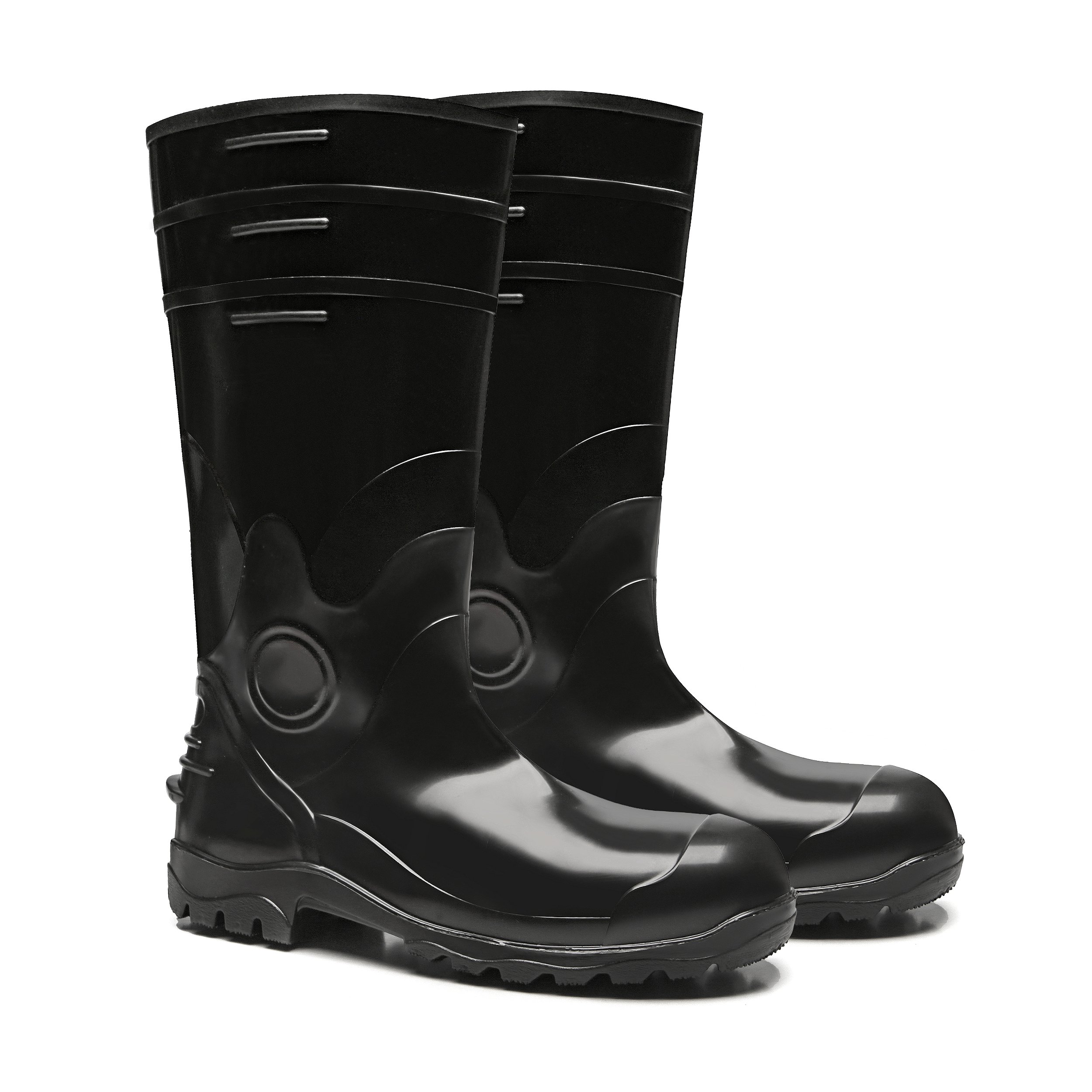 Bota impermeável ocupacional em PVC linha ACQUALEV, cano longo com espessura de 2mm e estrias laterais que facilitam o calce e estria no calcanhar para descalce, confeccionada em policloreto de vinila (PVC), com adição de massa nitrílica proporcionando melhor resistência a abrasão, ressecamento e trincas, com forração interna em poliéster e com biqueira em aço carbono, solado PVC reforçado com massa nitrílica com palmilha de aço resistente a perfuração, resistente a escorregamento (SRC), óleo combustível (FO) e com abosrção de impacto na região do calcanhar (E), toque emborrachado e acabamento espelhado, favorecendo a higienização, com resistência química.