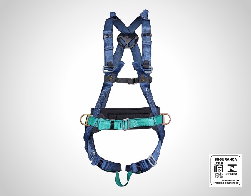 Cinturão paraquedista/abdominal com dois pontos de conexão para proteção contra quedas, um ponto para posicionamento em altura e um ponto para movimentação e espaço confinado. Possui almofada para conforto lombar.