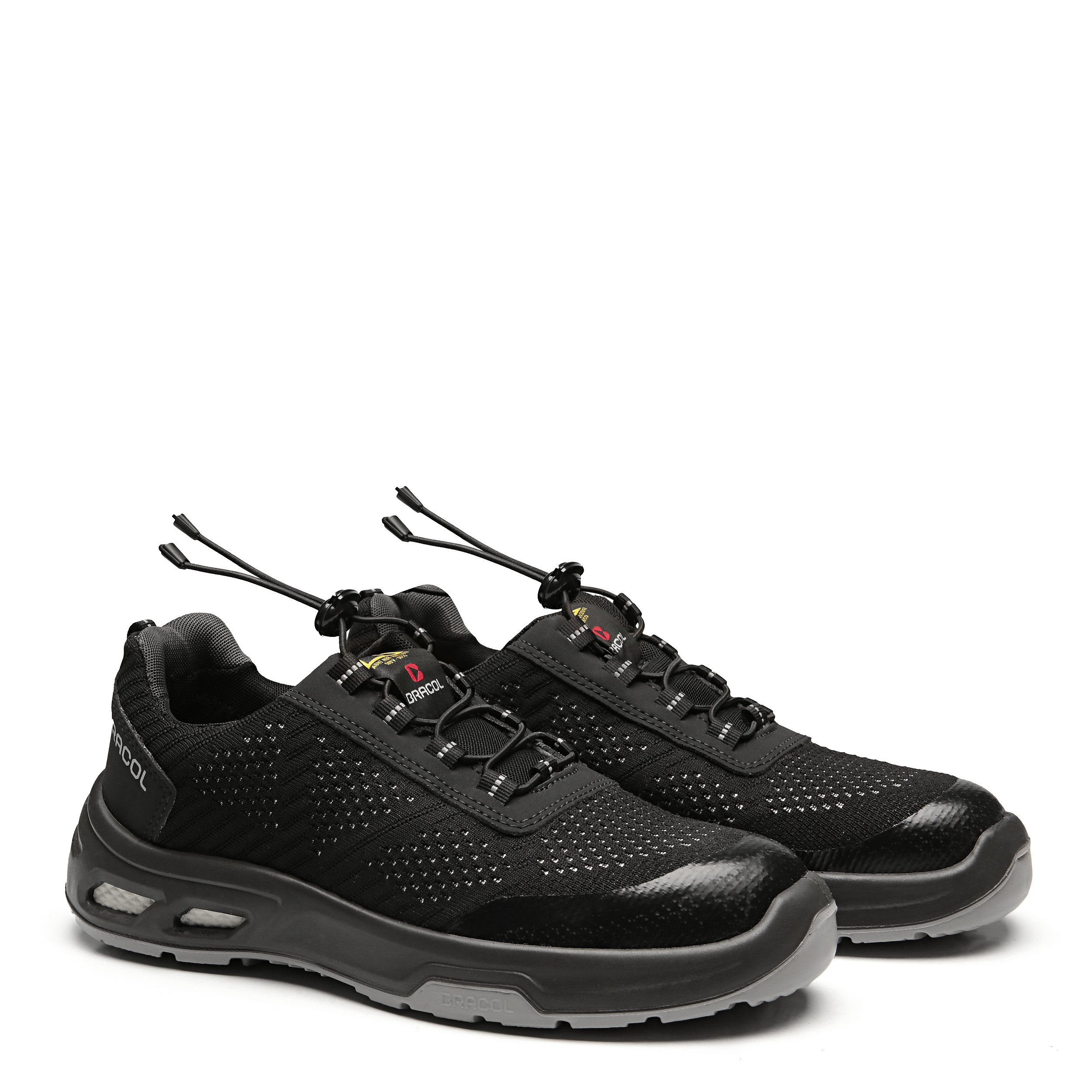 Tênis de segurança isolante elétrico, confeccionado em tecido sustentável com fechamento em cadarço, colarinho acolchoado, forração interna, biqueira plástica conformada, solado de poliuretano (PU) tridensidade, constituído por três camadas.