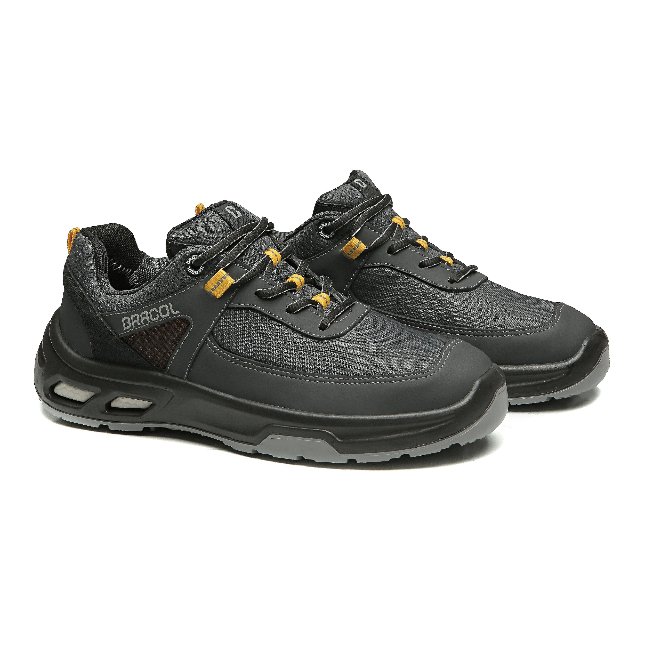 Calçado ocupacional de amarrar, tipo tênis, cano alto, com colarinho acolchoado, confeccionado em microfibra hidrofugada, gáspea em fibra de poliéster e cano em napa soft micro perfurada, com forração interna da gáspea em não tecido e forro do cano em tecido com alto poder de absorção, bico em polipropileno, palmilha de montagem em não tecido, costurada pelo sistema strobel, palmilha de conforto removível para higienização em PU 8,5 mm na região calcânea e 3,5 mm na região plantar, solado de poliuretano (PU) tridensidade, constituído por três camadas, injetado diretamente no cabedal, com resistência a escorregamento (SRC) e com absorção de impacto na região do calcanhar (E).
