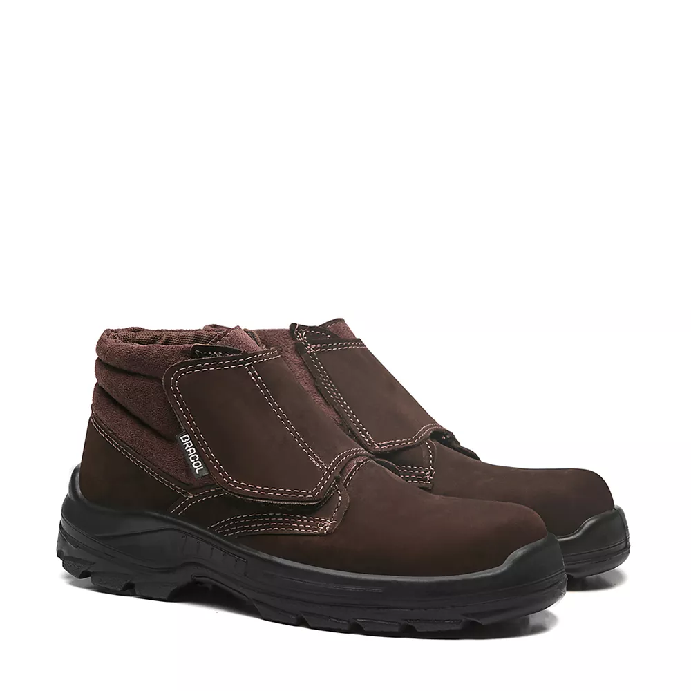 Botina de segurança fechamento em velcro, cabedal construído em couro nobuck, com forração interna no colarinho e dorso em tecido, forração interna da gáspea em não tecido e forração do cano em tecido acolchoado com espuma, biqueira de composite, palmilha de montagem em não tecido costurada pelo sistema strobel e sobre-palmilha de conforto em EVA. solado em poliuretano (PU) bidensidade, injetado diretamente ao cabedal, resistente a escorregamento (SRC), óleo combustível (FO) e com absorção de impacto na região calcânea (E).